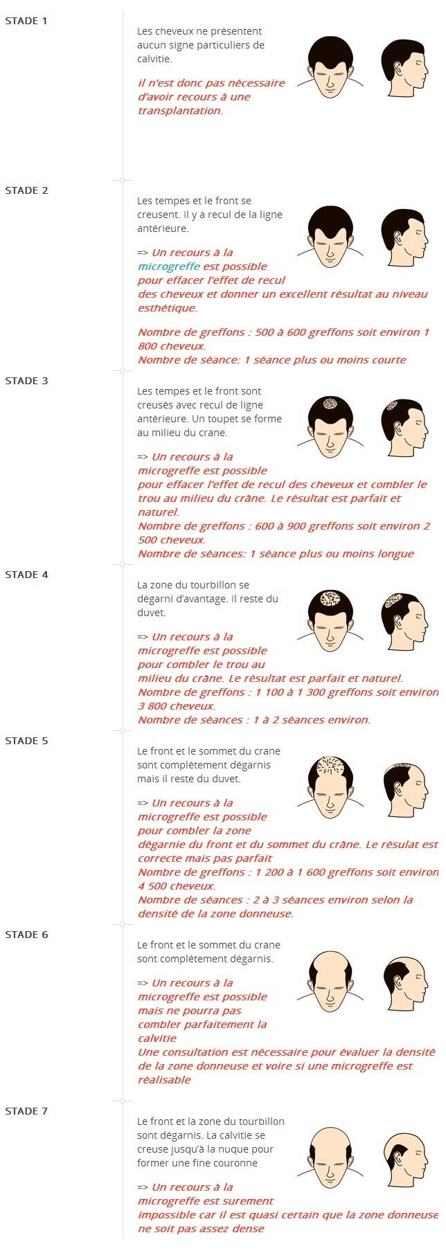 Men can experience more or less severe hair loss and there are different stages defined in order of gravity by the Hamilton-Norwood scale: there are around 7 stages of alopecia.