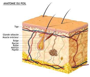 C’est dans cette bulle que se forme le bulbe, la base et la seule partie vivante du poil. En grandissant, la tige du poil sort de la peau, et c’est la seule partie visible du poil dite kératinisée .Le poil est une sorte de tige plus ou moins longue, dure et épaisse, selon la zone du corps et l’individu, qui se crée dans une petite bulle sous la peau, qu’on appelle le « follicule pileux ».